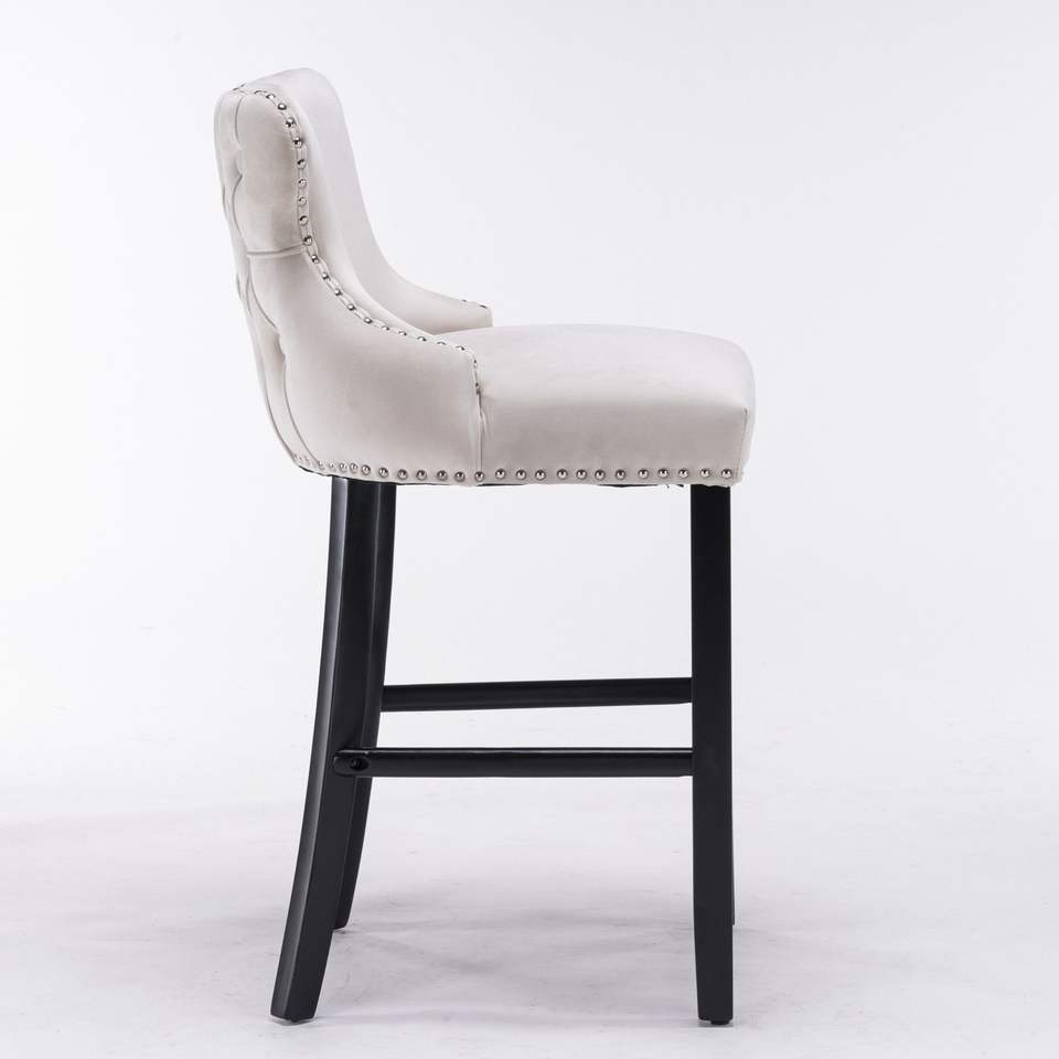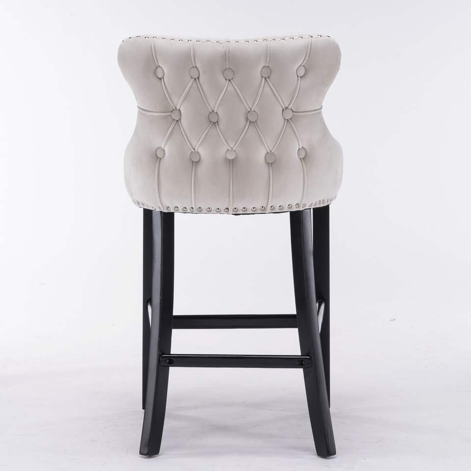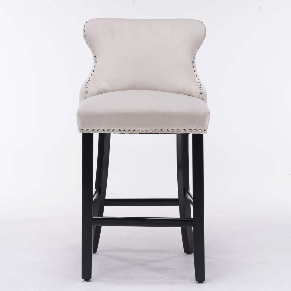 Contemporary Beige Bar Stools Set 4 Wing-Back Velvet Upholstered Wooden Legs Chrome Nailhead Trim Button Tufted Decoration