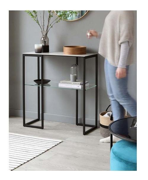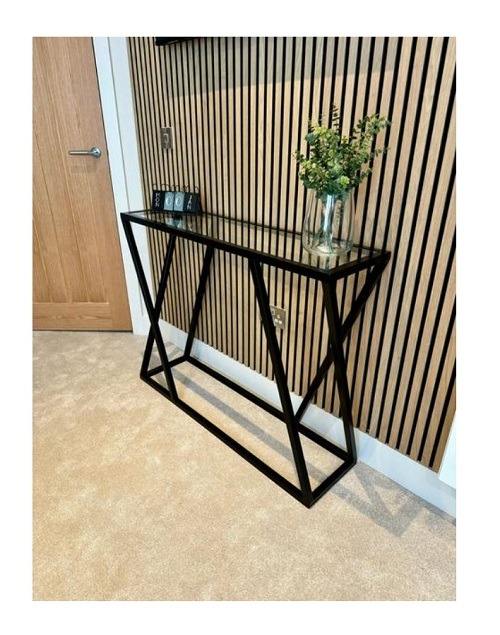 Table console contemporaine en métal noir avec dessus en verre, parfaite pour la décoration luxueuse du salon et l'ambiance élégante de la maison