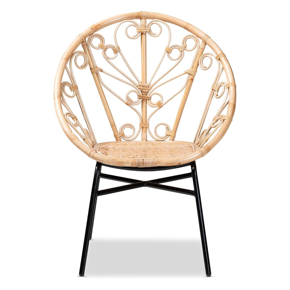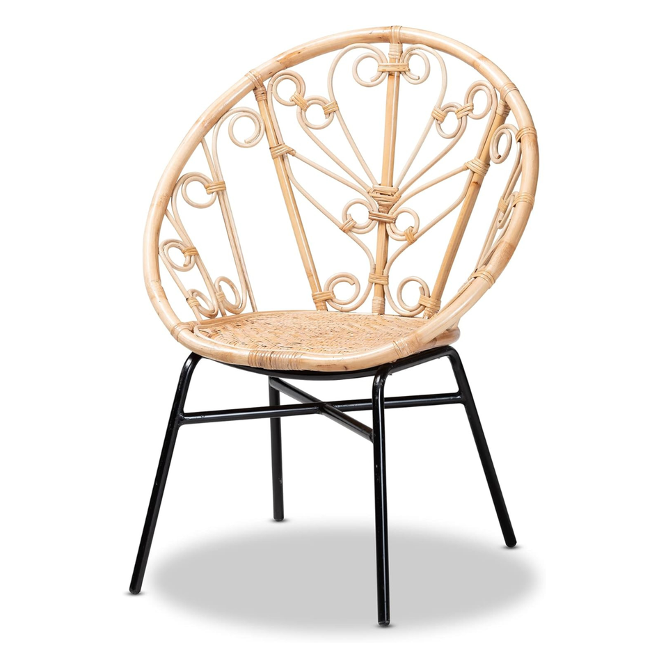 Chaise ronde en rotin élégante et contemporaine avec pieds en métal, pour la maison, le bureau, la salle à manger, l'extérieur, avec détails tressés, mobilier moderne pour hôtel, villa