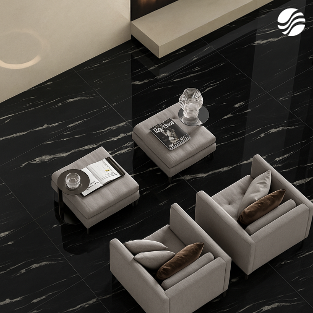 Contemporary Elos Black Marble Effect Tiles Polished Porcelain 600x1200mm Wall and Floor Design Indian Fractal Overseas