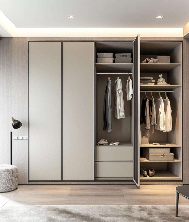 Armoire contemporaine autoportante en bois mélaminé portes à charnières pour appartement chambre à coucher hôtel caractéristiques propres pliantes pour vêtements