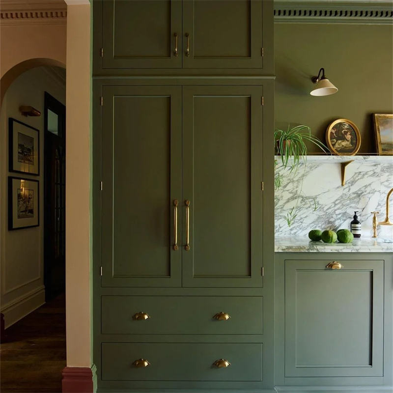 Armoire de cuisine contemporaine avec façade peinte en vert et plan de travail en quartz, le tout dans un design minimaliste