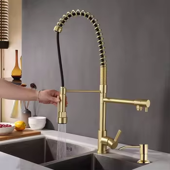 Robinet de cuisine contemporain Pont supérieur Nouveau style Design coulissant Or brossé/Nickel Caractéristiques Distributeur de savon à eau chaude et froide