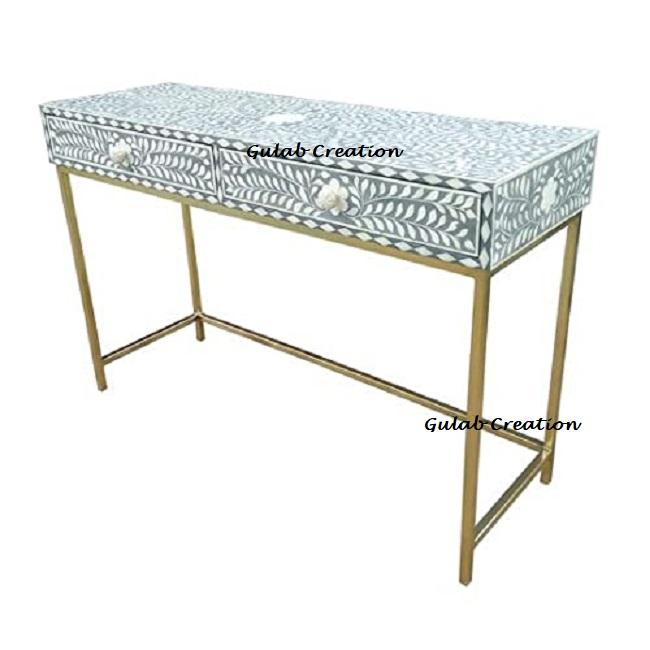 Table d'appoint de rangement en incrustation d'os à 2 tiroirs au design floral gris fabriqué à la main pour chambre à coucher, salon et décoration intérieure de luxe
