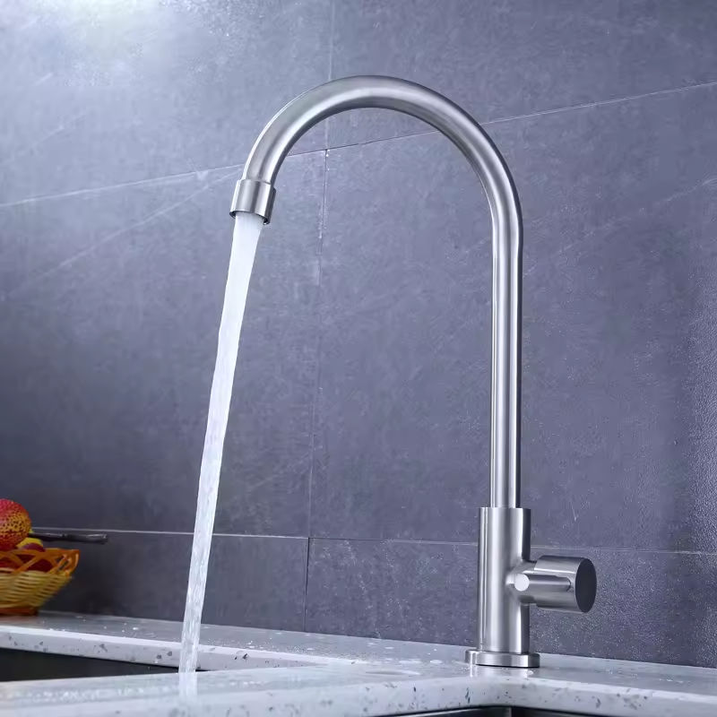 Robinet de cuisine monocommande contemporain avec bec pivotant à 360 degrés en acier inoxydable, mitigeur eau froide simple