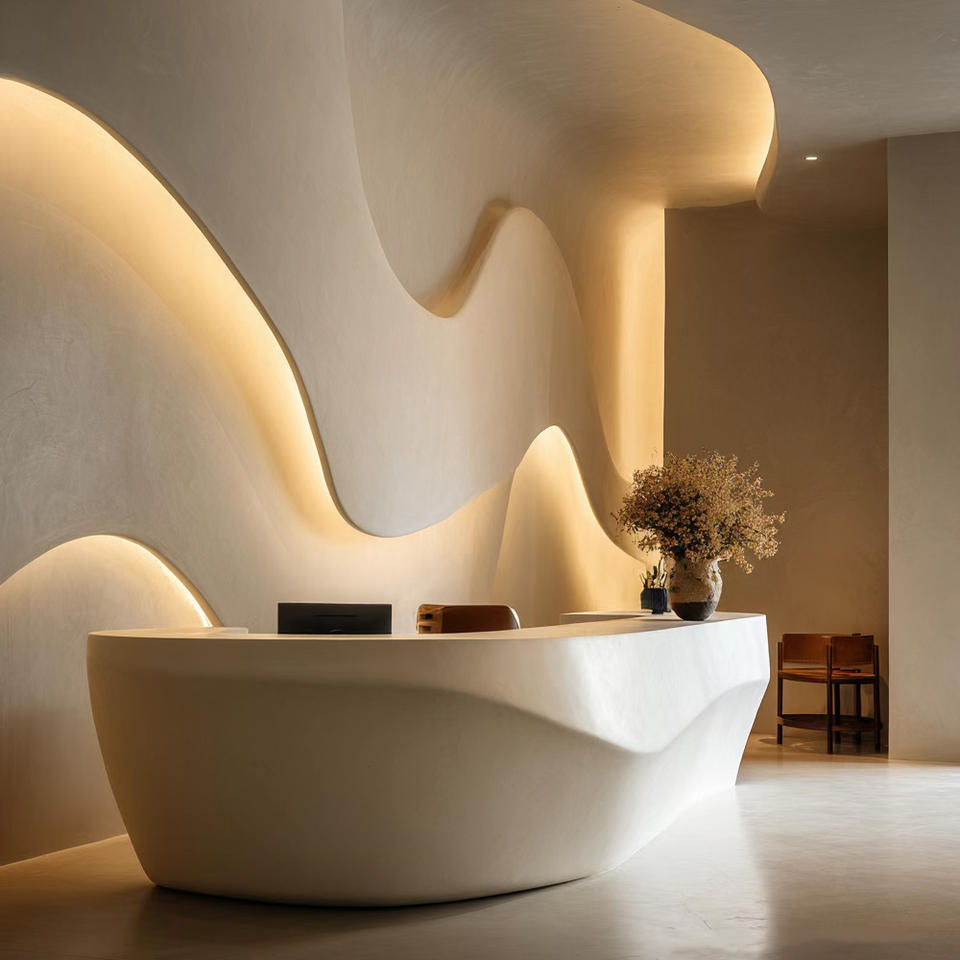 Bureau d'accueil contemporain en pierre douce avec des courbes fluides pour des espaces de travail élégants, des hôtels de luxe et des intérieurs publics modernes