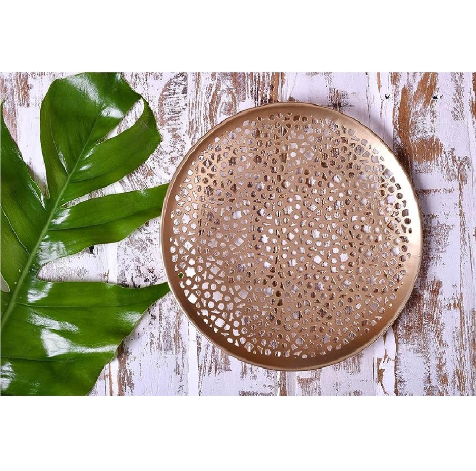 Plateau de service rond en métal martelé au nickel de haute qualité de style contemporain avec poignées découpées pour la maison, les hôtels et les restaurants