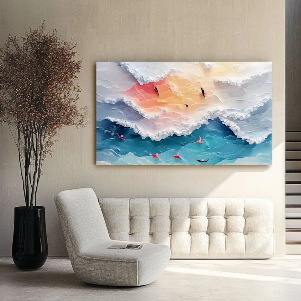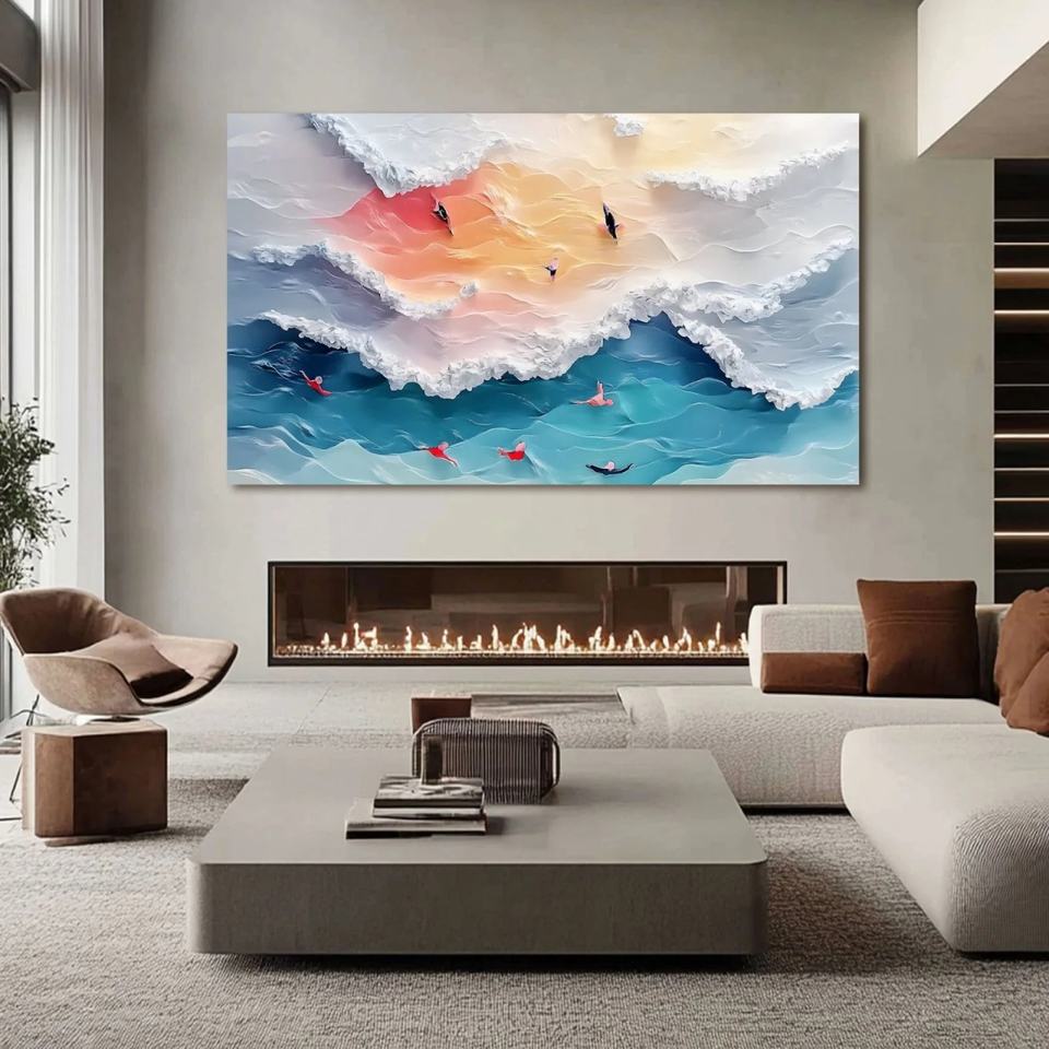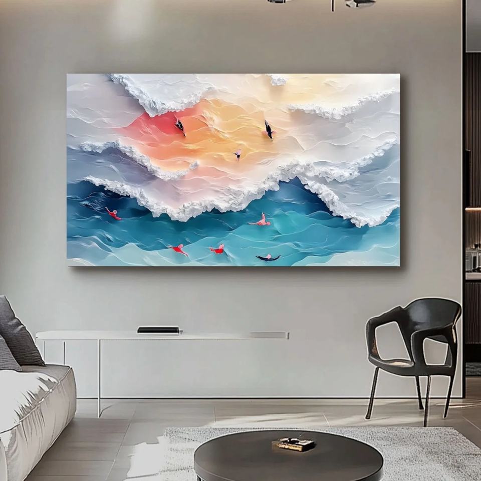 Peinture à l'huile texturée contemporaine, paysage marin horizontal, vagues colorées, art mural texturé minimaliste pour la maison et la galerie