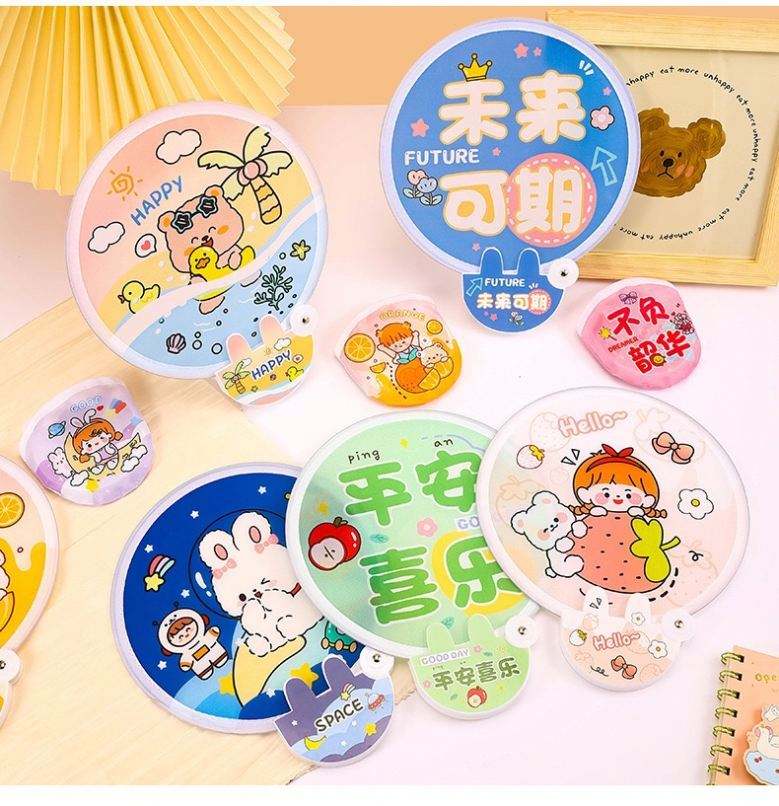 Mini-ventilateur pliable pratique pour étudiant, portable, en plastique, avec motif de dessin animé réfléchissant, recouvert de tissu, pour l'extérieur