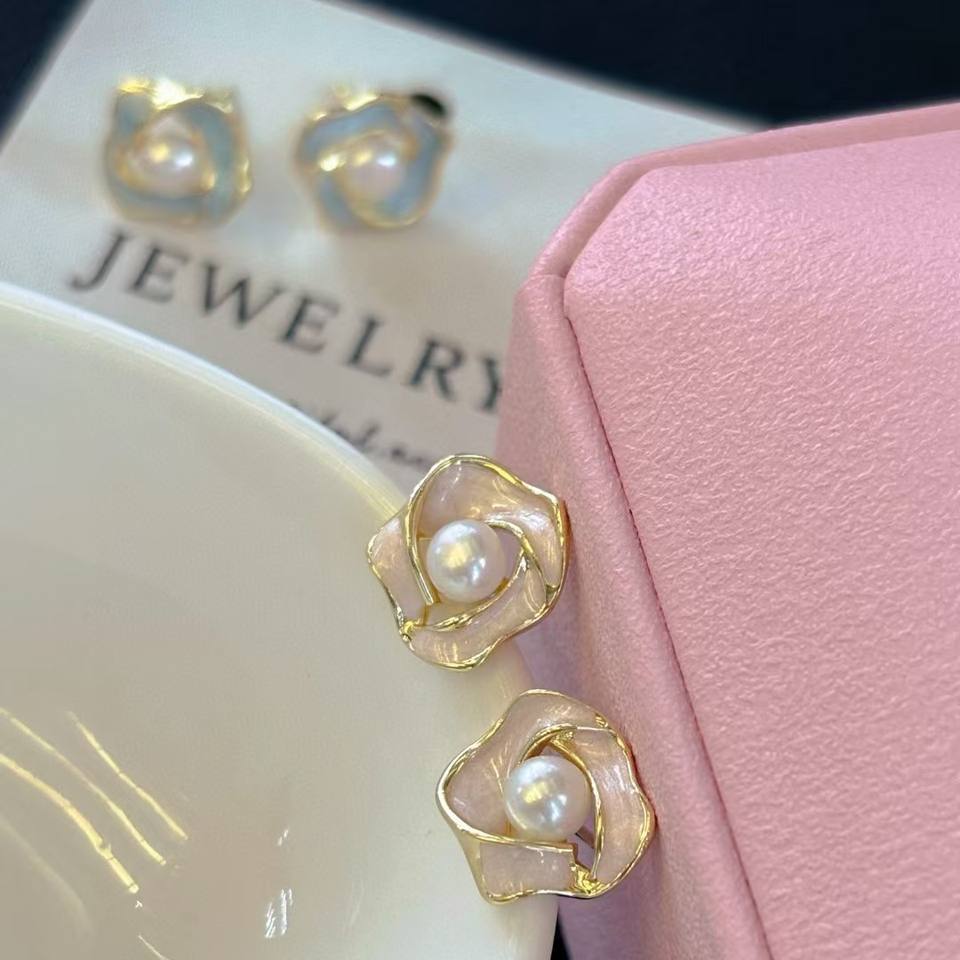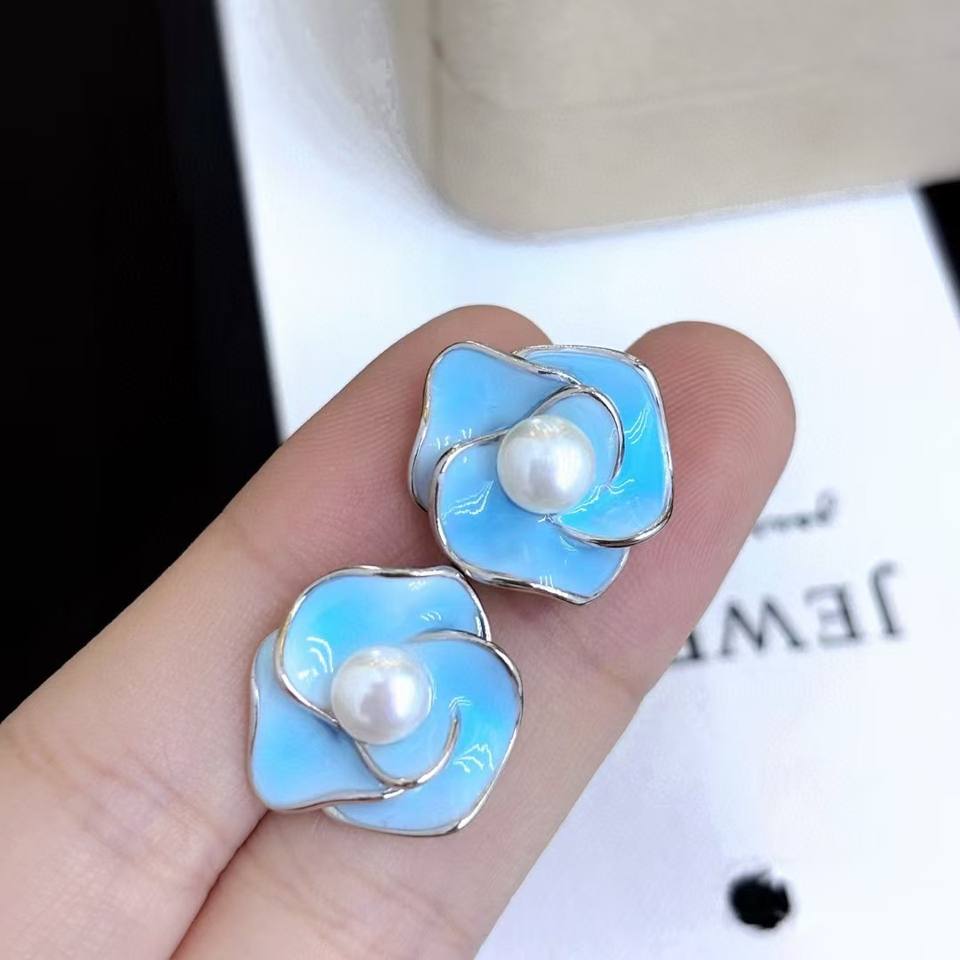 Cool Fashionable Pure Silver Stud Earrings with Blue Petals Color Preserving Freshwater Pearls Inspired by Oil Tea Flower