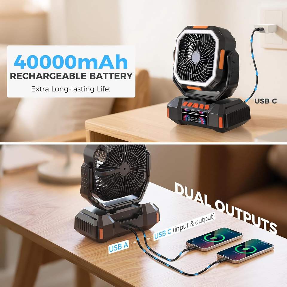 Ventilateur de refroidissement 40000mAh rechargeable avec télécommande, lumière LED, charge USB, ventilateur de camping, ventilateur d'extérieur