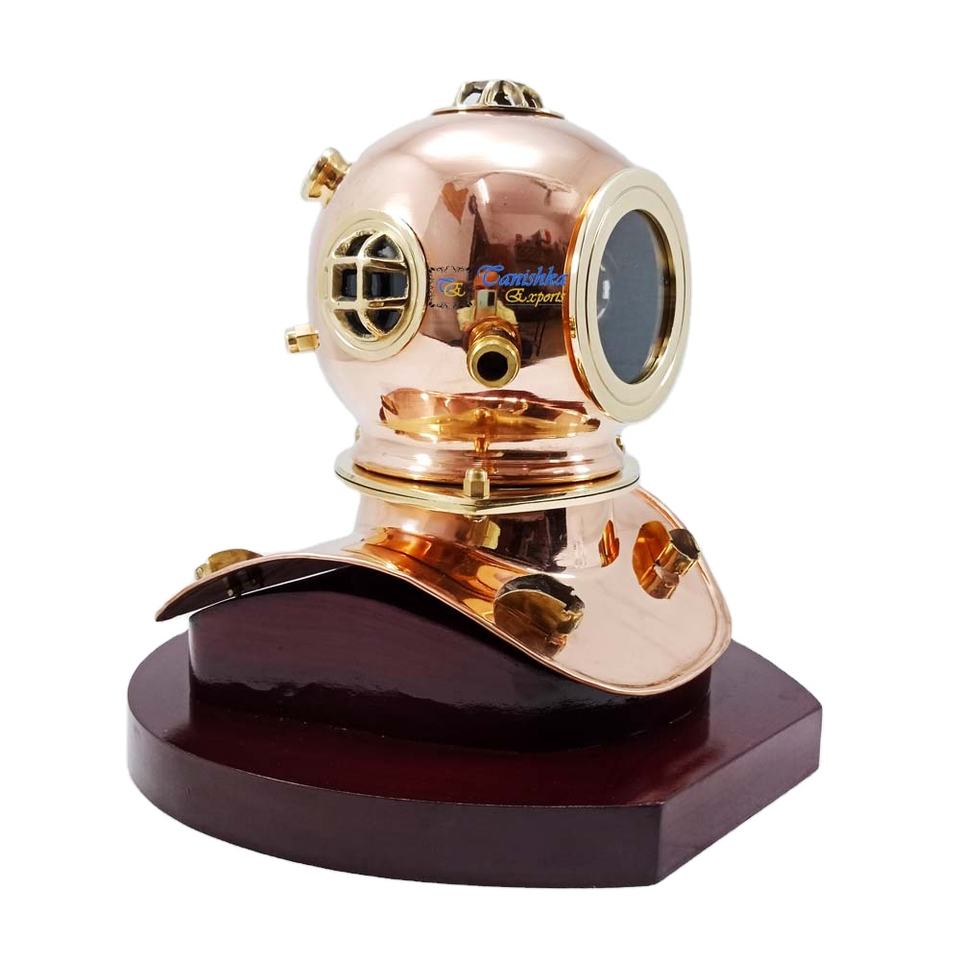 Casque de plongée médiéval miniature en fer, fait main, moderne, pour homme, thème nautique marin, avec base en bois et finition électrolytique