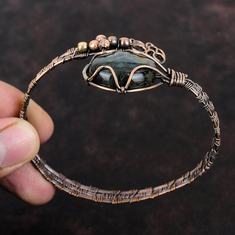 Bracelet en cuivre ajustable avec labradorite, fil enroulé, fait main, cadeau