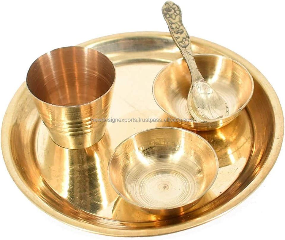 Plateau rond en cuivre Bhog Thali, ensemble de puja Laddu Gopal Krishna avec logo personnalisé, verre Katori et cuillère pour un usage domestique ou en temple