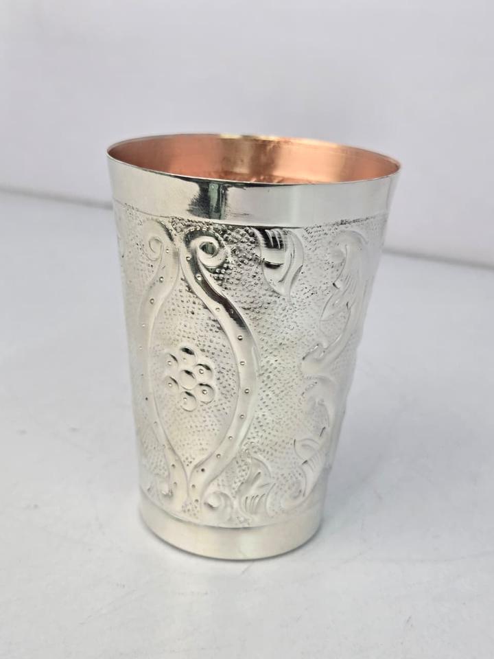 Tasse à Lassi Traditionnelle Indienne Faite à la Main en Verre Embossé Revêtu d'Argent 999.9 Cuivre, 250ml, Écologique et Légère, WB Inc