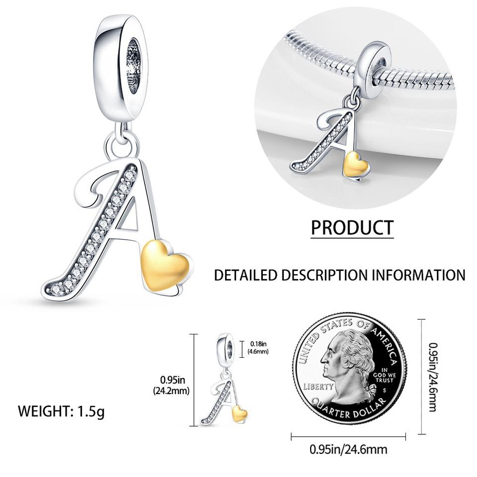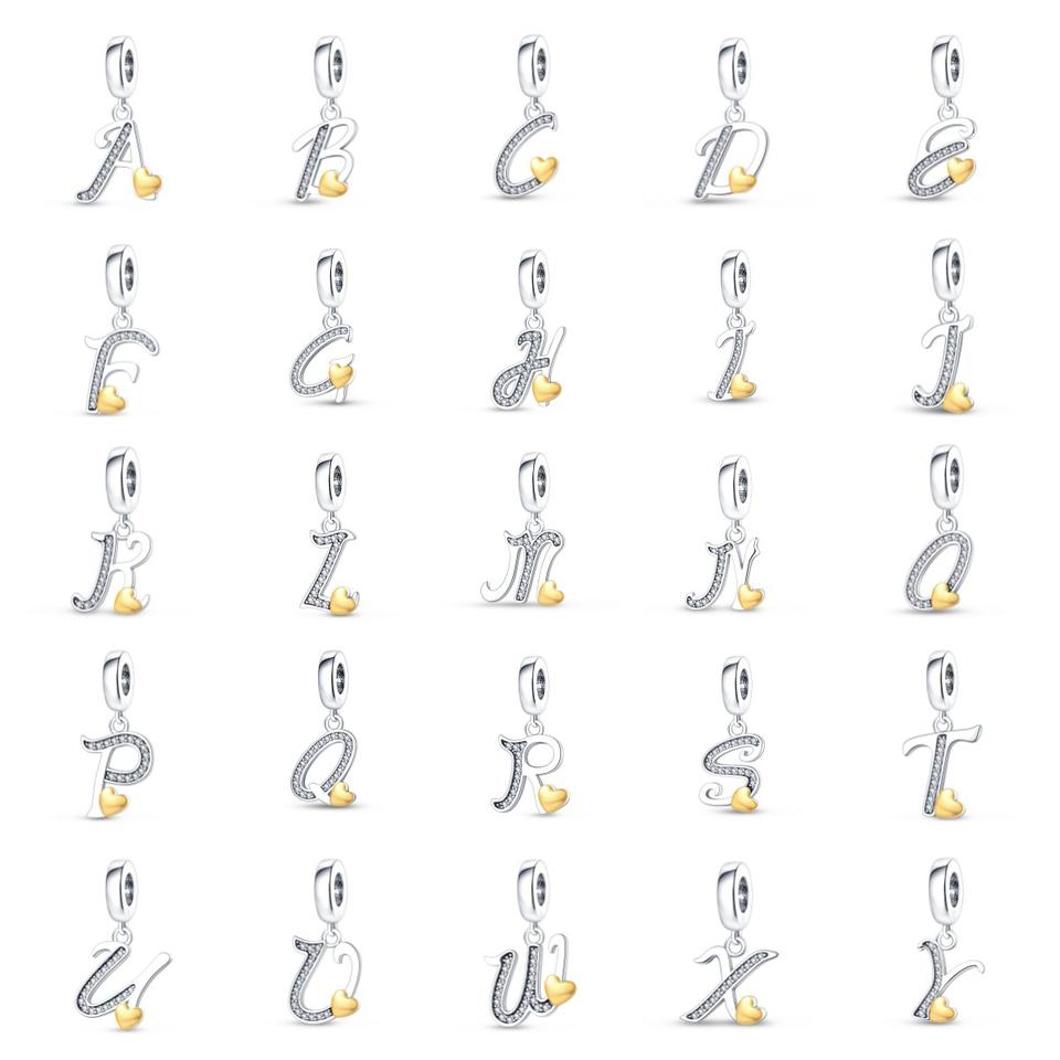 Breloques en forme de cœur avec lettres de l'alphabet en cuivre plaqué argent bicolore, perles CZ, compatibles avec les bracelets européens