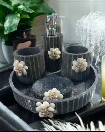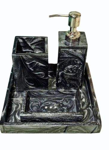 Ensemble d'accessoires de salle de bain en résine motif tourbillon de cuivre : Distributeur de savon liquide, Gobelet porte-brosse à dents, Porte-savon solide, Plateau de vanité, Kit de comptoir