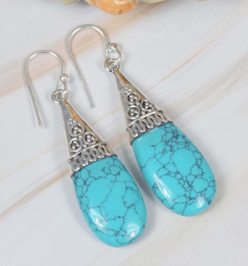 Copper Turquoise Earrings 925 Sterling Silver Gemstone Hook Earring December Birthstone Handmade Jewelry Pear Shape Gift for Her