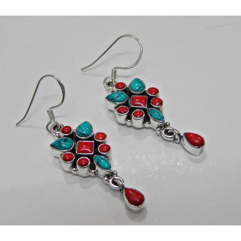 Coral & Turquoise 925 Sterling Silver Earrings Boho Wedding Gift Natural Gemstones Gold Jewelry for Her