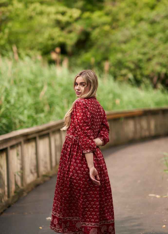 Corly Bohemian Pure Cotton Midi Dress Hand Block Printed Floral Red Rose Ethical Fashion