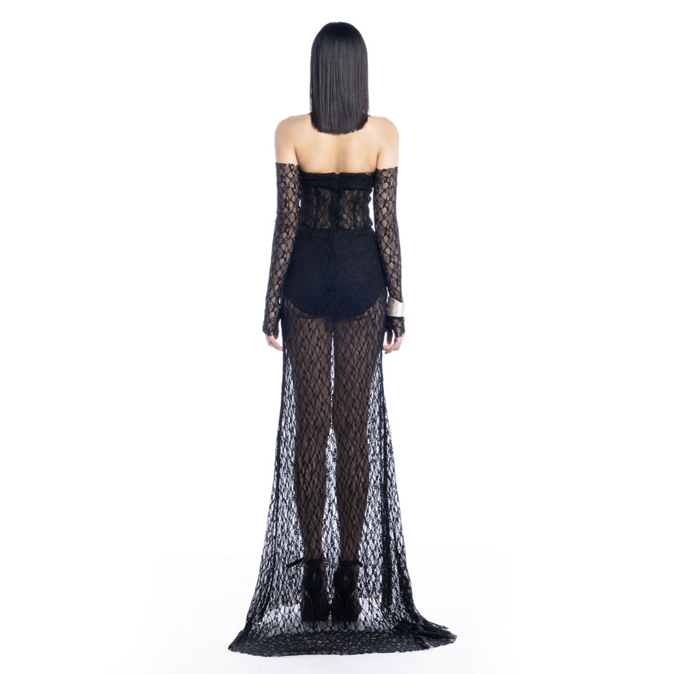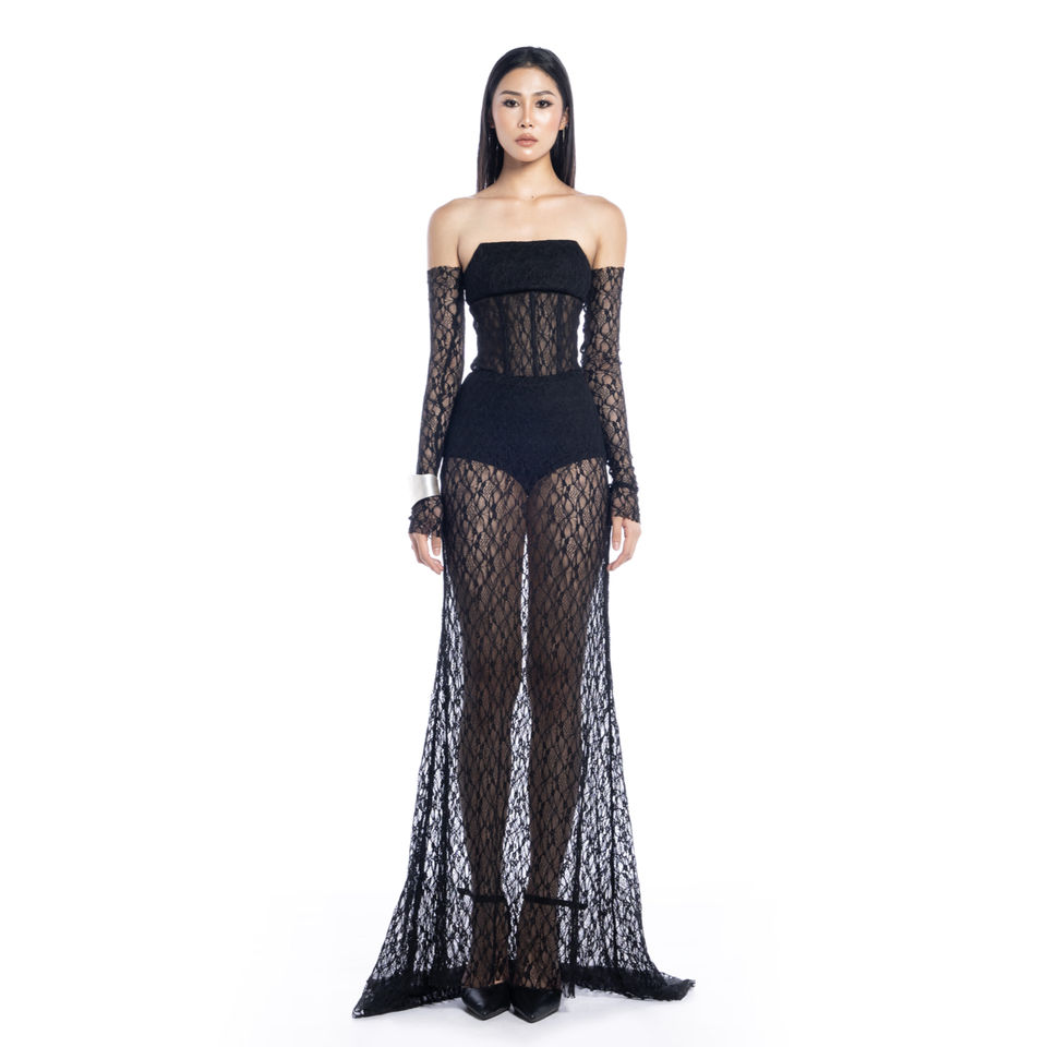 Technics:Entire body made from stretch lace with honeycomb pattern.
