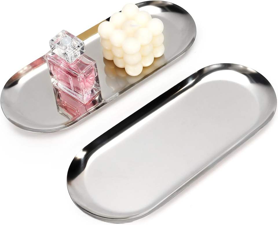 Plateau organisateur de cosmétiques, plateau de rangement en acier inoxydable, plateau de service ovale en métal, acier inoxydable moderne