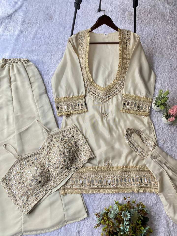 Ensemble haut et pantalon palazzo en tissu Cosmos avec broderie miroir, bordure en dentelle et dupatta, tenue ethnique pour femmes