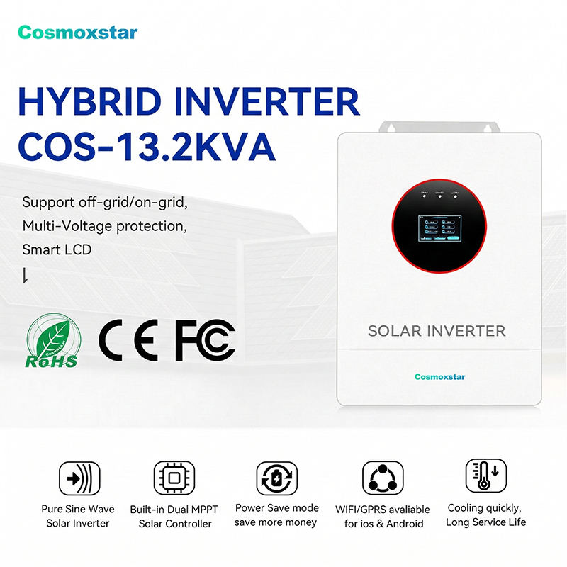 Cosmoxstar Onduleur Hybride Portable Standard UE 13,2 kVA Monophasé Hybride Connecté au Réseau CA 48 V 230 V Onduleur de Stockage d'Énergie