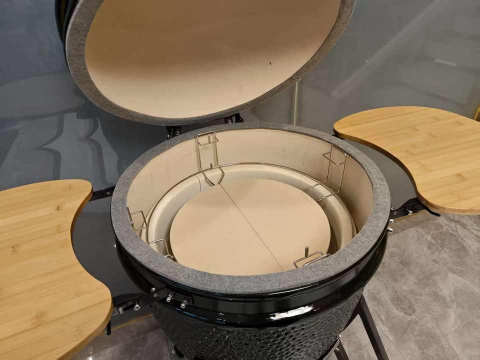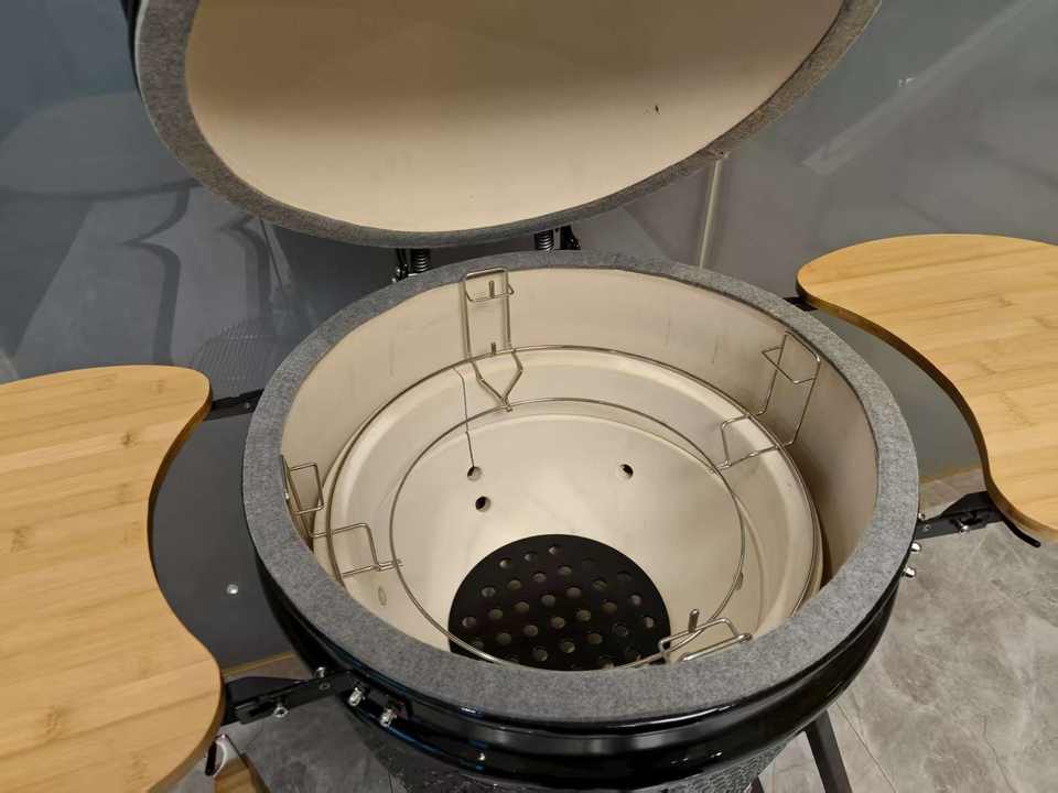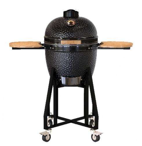 Barbecue au charbon de bois Kamado en céramique de 18 pouces avec chariot et table d'appoint pliable en bambou pour barbecue en plein air