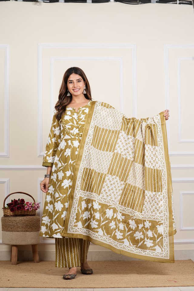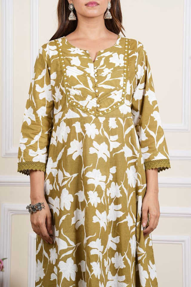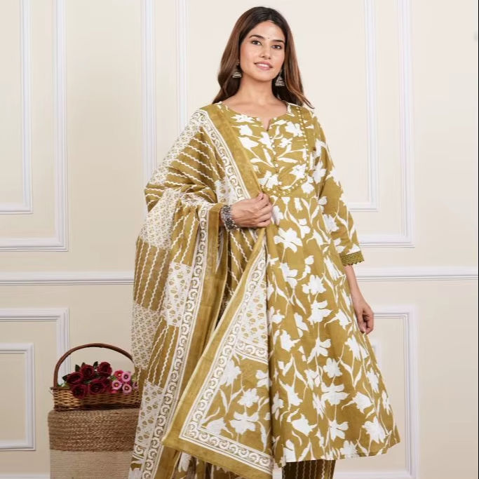 Ensemble Anarkali en coton à imprimé floral et broderies miroir, col en V, manches trois-quarts, longueur cheville, avec pantalon et dupatta, séchage rapide, idéal pour l'été et la protection solaire