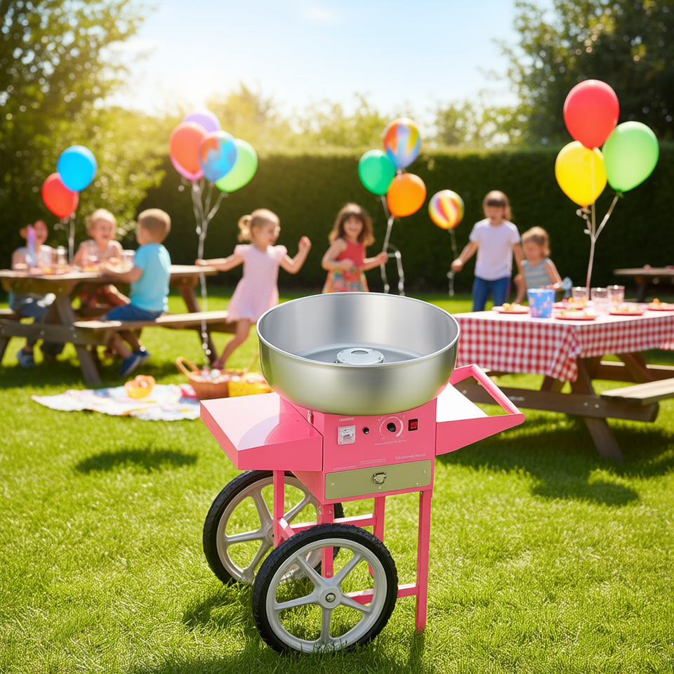 Machine à barbe à papa 1000W rose sur chariot pour fêtes et usage commercial