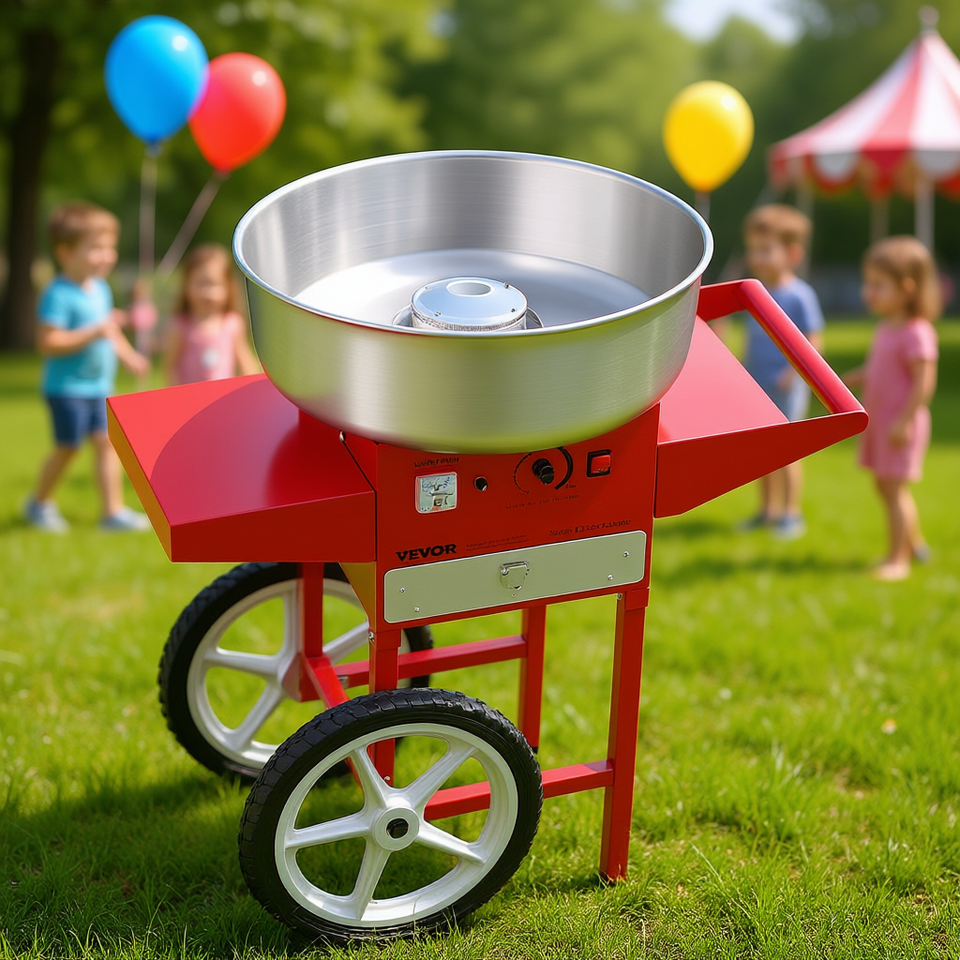 Machine à Barbe à Papa Commerciale 1L avec Chariot Prête à l'Emploi pour Fêtes Rouge