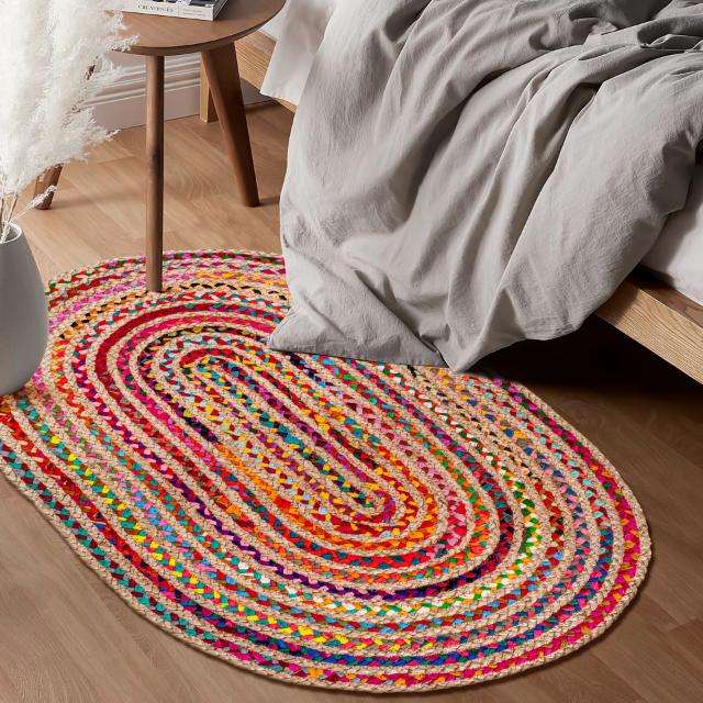 Tapis Chindi en coton, prix de gros, recyclé, multicolores, tapis tressé Chindi fait à la main en forme ovale, tapis réversible en coton et jute
