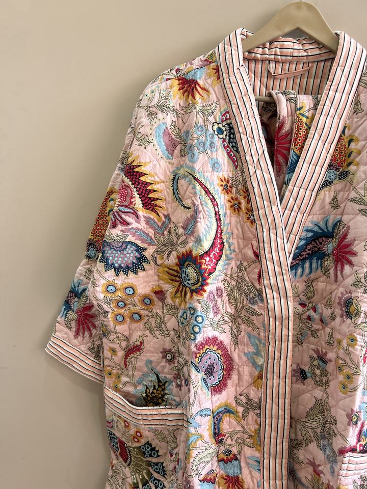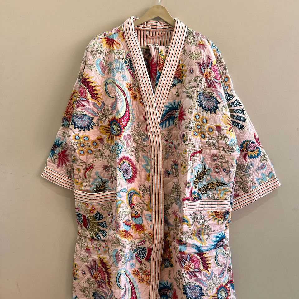 Robe kimono matelassée à imprimé floral en coton, faite à la main, longue veste pour femme