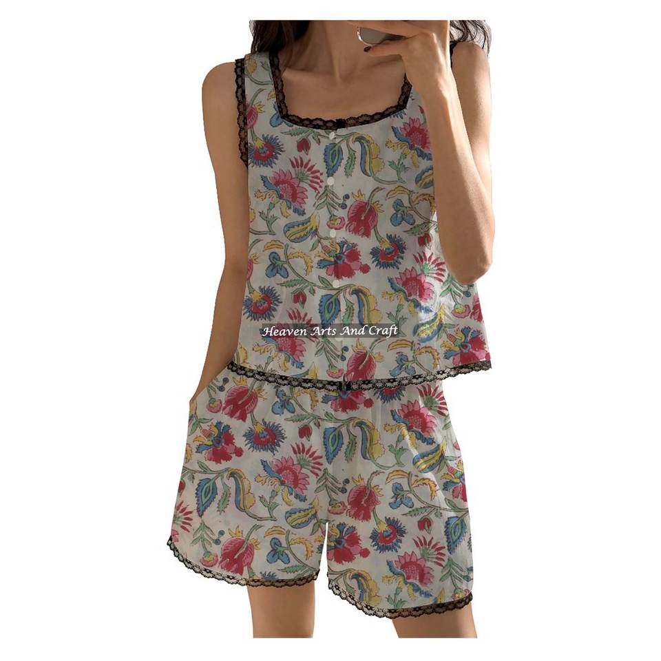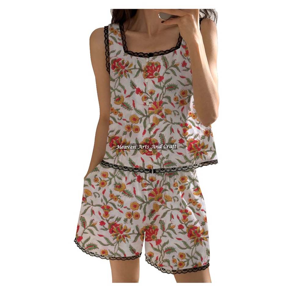 Ensemble pyjama en coton imprimé à la main avec dentelle florale, short et haut sans manches à volants, collection printemps/été
