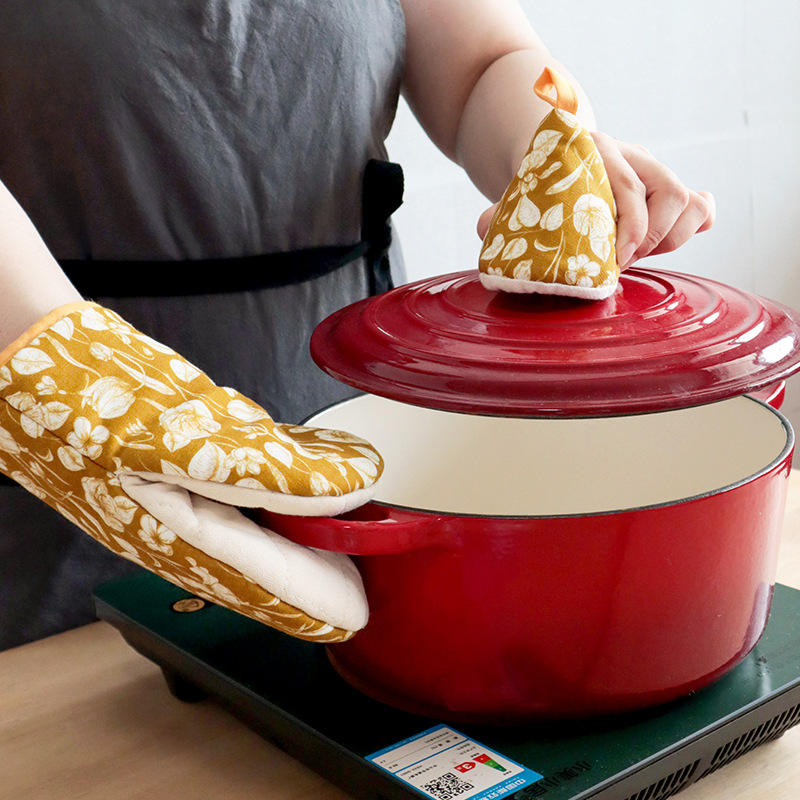 Ensemble de gants de four en coton avec couvercle de pot et set de table, motif floral, tulipes jaunes, feuilles bleues, 18 cm, pour utilisation au four