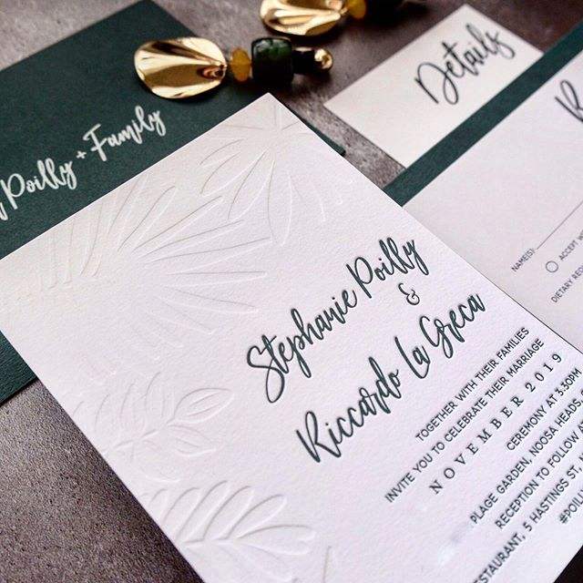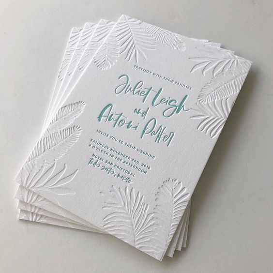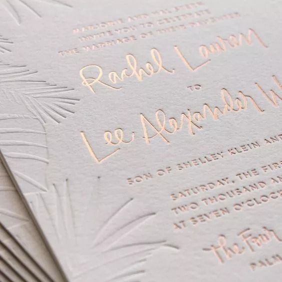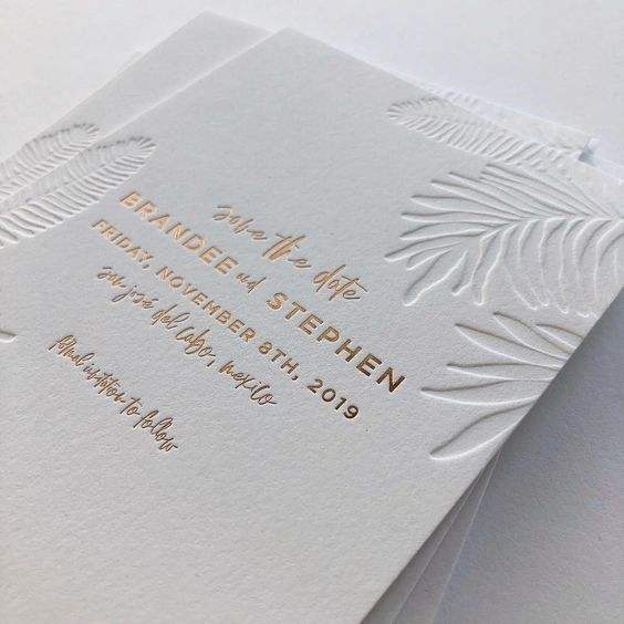 Invitations de mariage modernes en papier coton avec feuille d'or rose personnalisée et impression en relief sur feuille de palmier