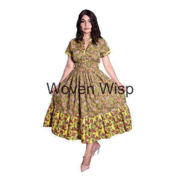 Robe mi-longue en tissu imprimé en coton sur mesure tissée écologique avec découpe de taille naturelle et décoration en dentelle