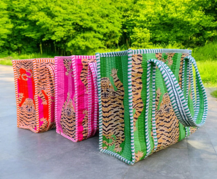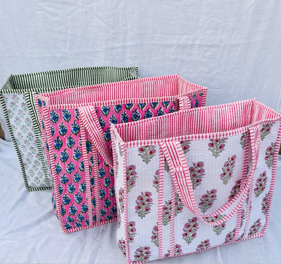 Sac fourre-tout en coton matelassé bohème à fleurs imprimé à la main, durable, pour femmes - Plage, voyage et cadeaux, cadeaux de Noël, mariage