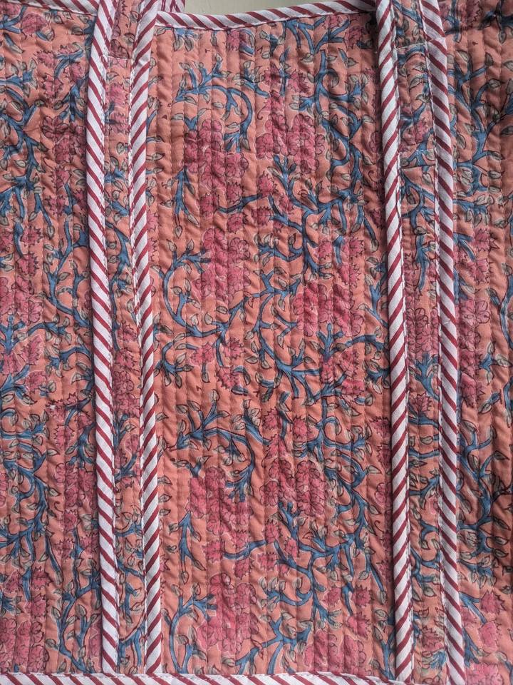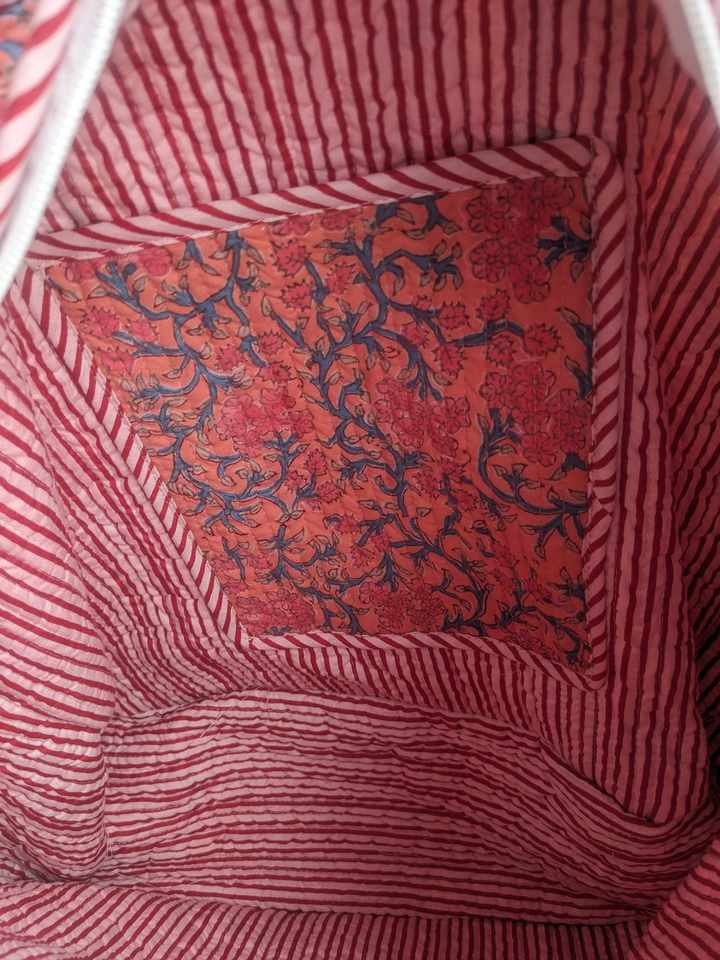 Coton matelassé imprimé à la main réversible grand sac fourre-tout écologique durable Boho Chic Style fermeture éclair fait à la main artiste tissu