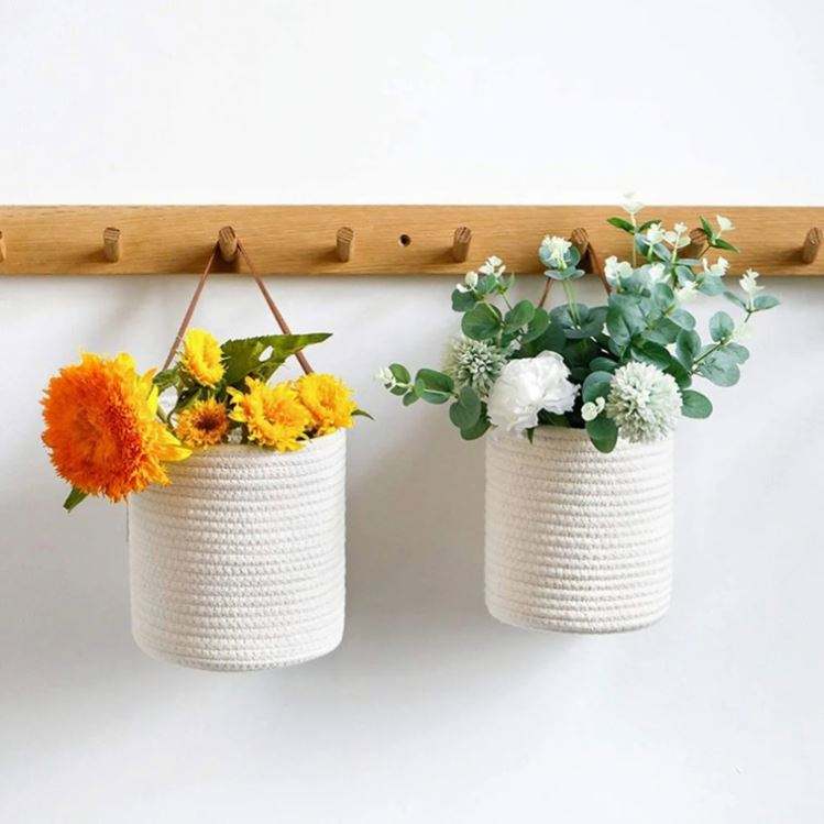 Panier de rangement en corde de coton, pot de plante en rotin avec support, mini panier tissé au crochet, panier suspendu pour plantes qui se suspend au mur