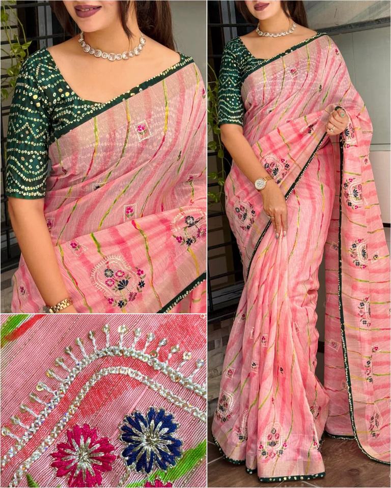 Sari en coton avec broderie complète, sequins, bordure en zari, design Bandhej, sari en Inde, vêtements