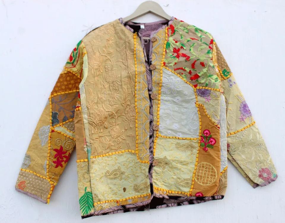 Femmes matelassé coton Sari Patchwork brodé bouton veste manteau Long tissé respirant écologique coupe-vent Tribal