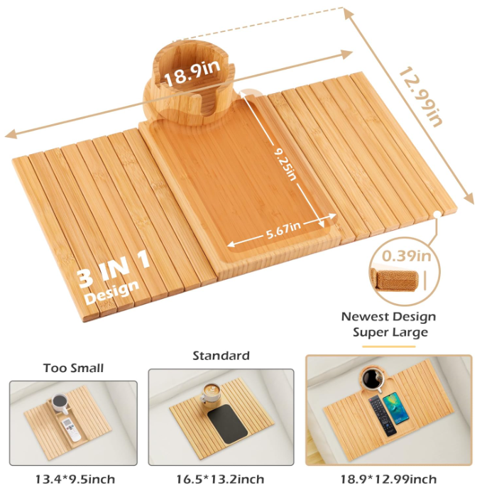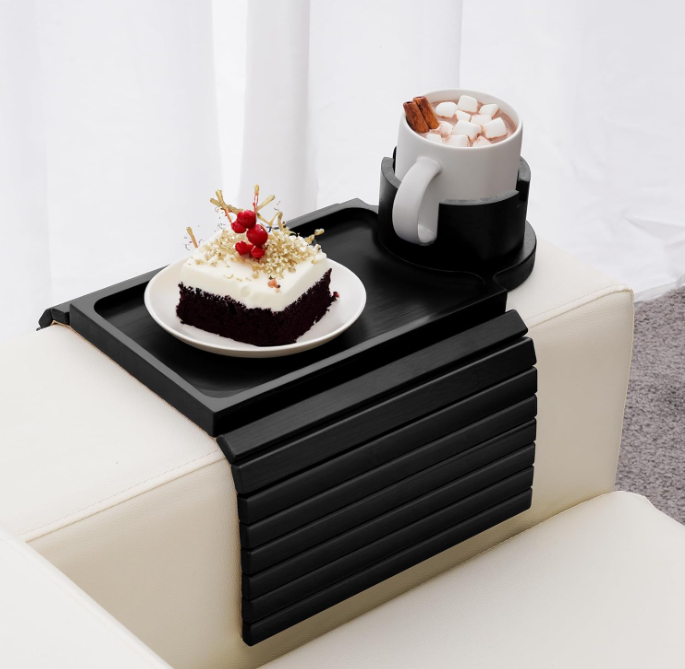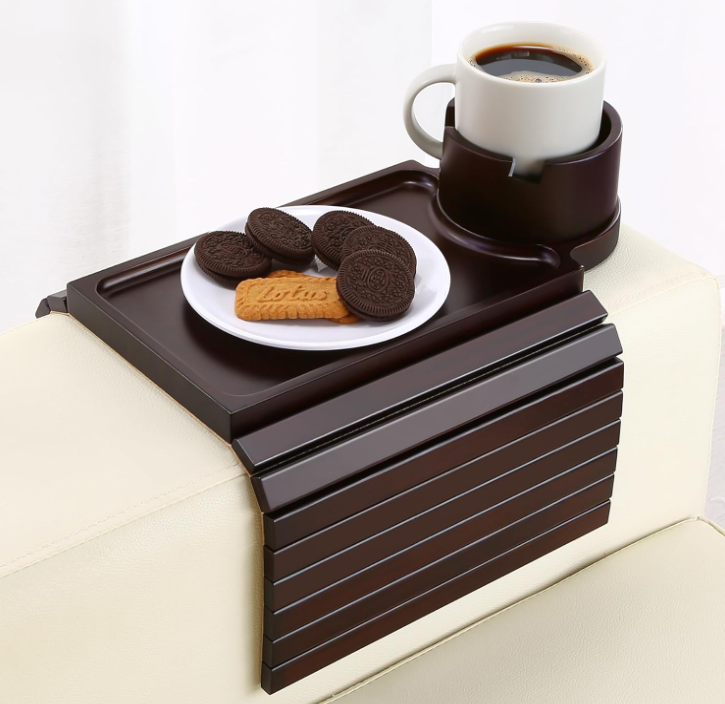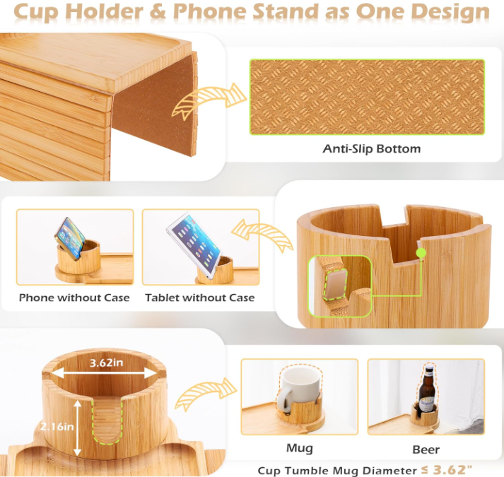 Plateau de bras de canapé Organisateur d'accoudoir de canapé en bambou avec porte-gobelet à 360 ° Plateau de collation antidérapant amovible pour le salon