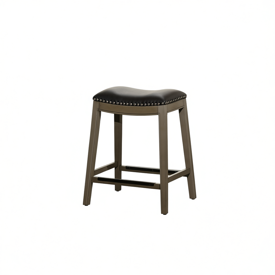 Tabouret de bar à hauteur de comptoir, 24 pouces, base en bois gris vieilli, assise en cuir noir, pour bars