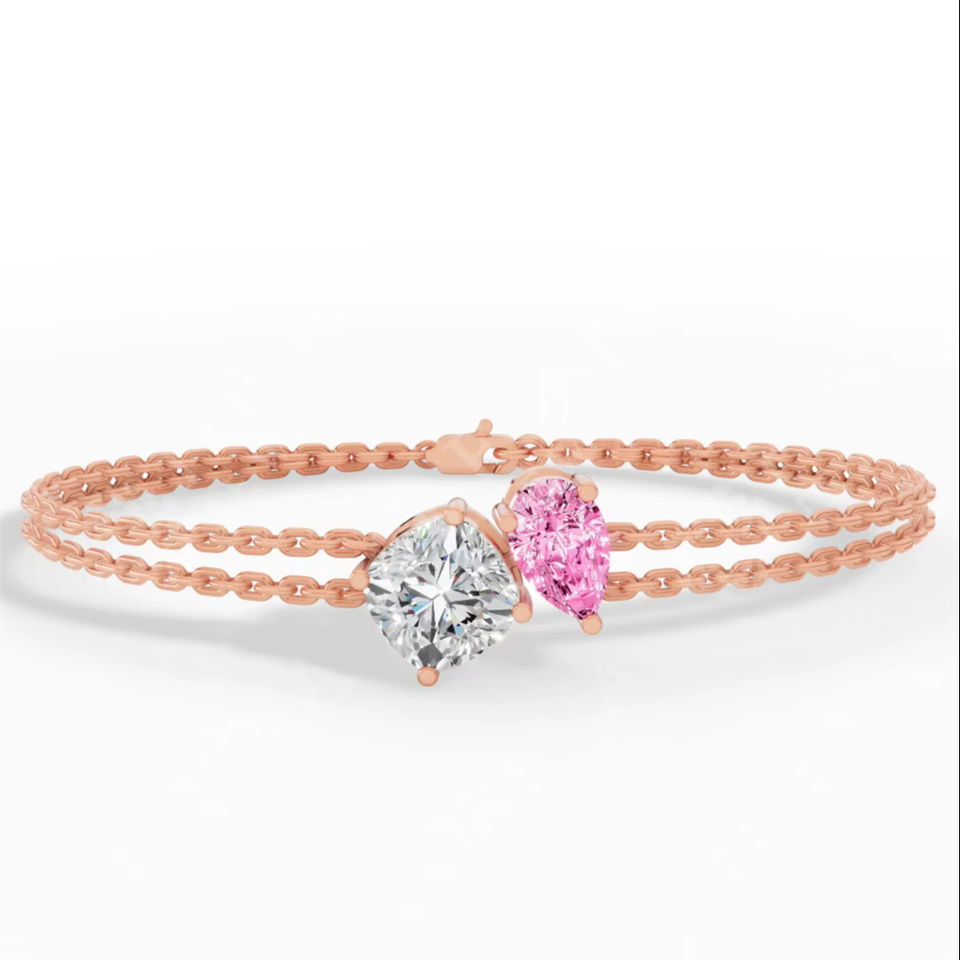 Bracelet délicat à double rangée Couture Toi Et Moi avec coussin bicolore et diamant rose taille poire cultivé en laboratoire, en or 18 carats, bijoux fins