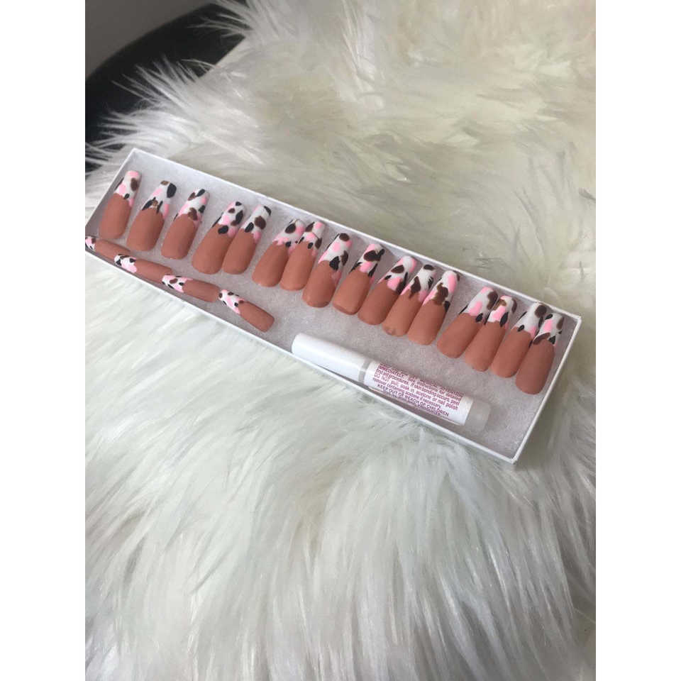 Ongles press-on mi-longs forme cercueil à motif vache