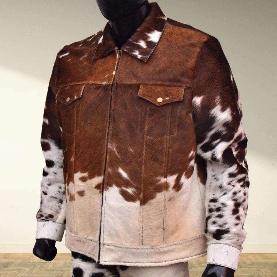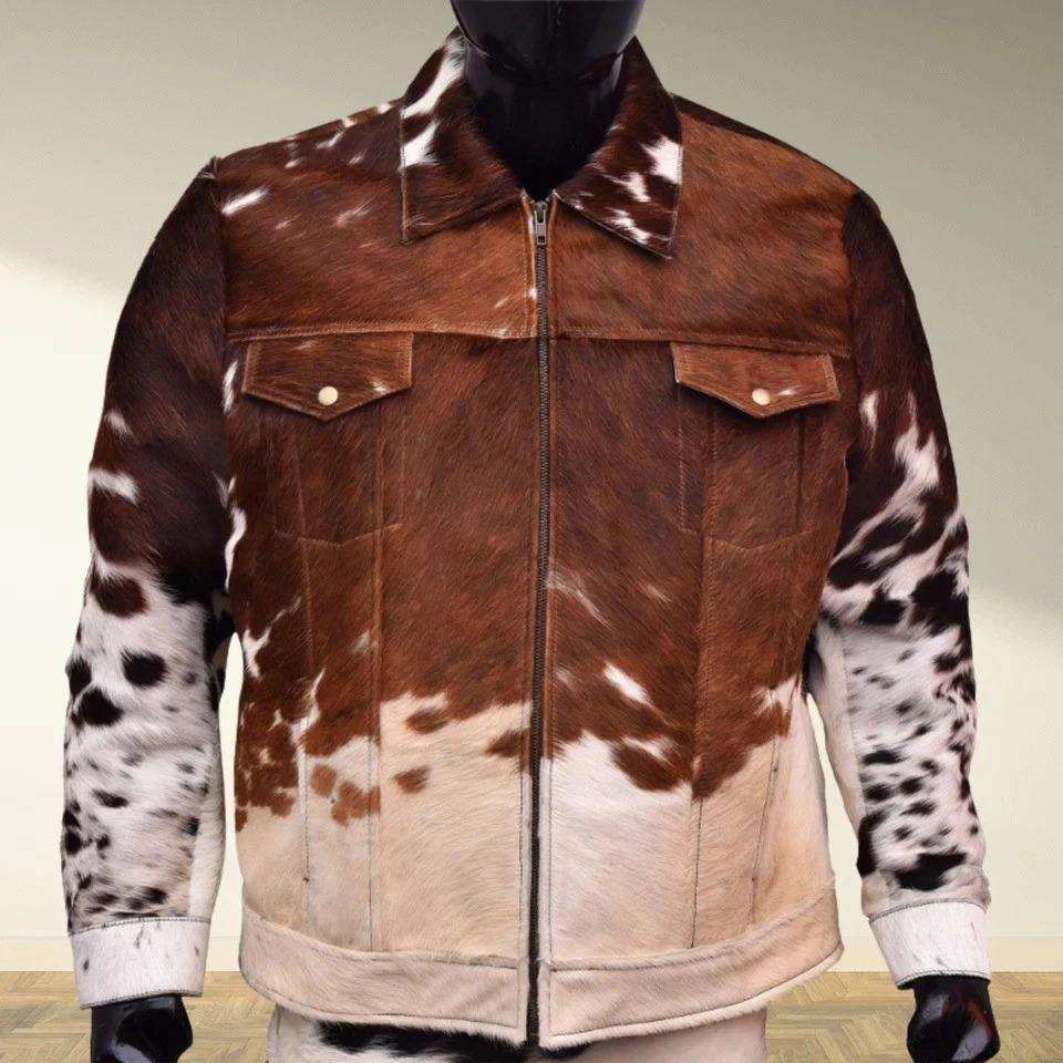Veste en cuir de cow-boy avec franges pour homme, en cuir de vache véritable, poches avant, fermeture éclair authentique, matelassage intérieur