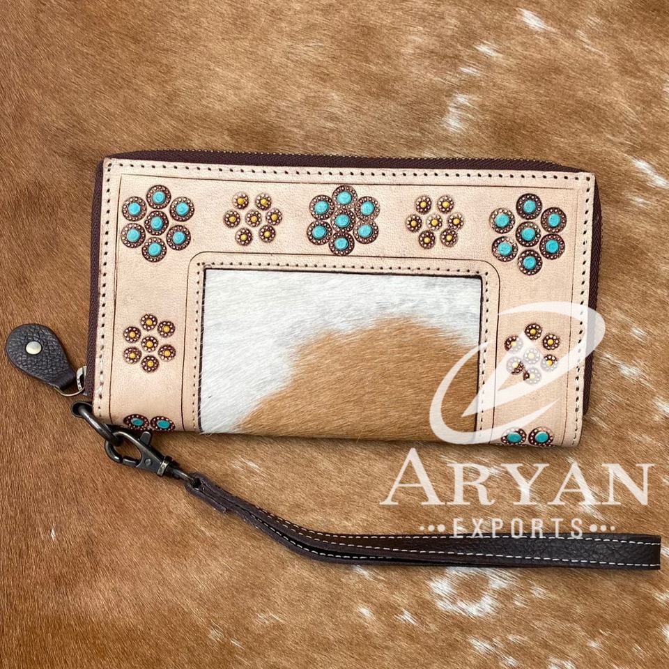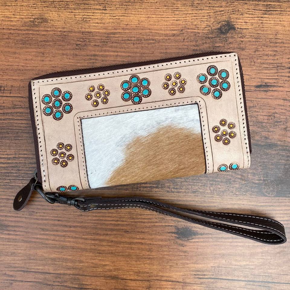 Fourrure de peau de vache usinée à la main sculpture portefeuille pochette coque de téléphone élégant concepteur portefeuille Multi utilisations Western cuir bracelet portefeuilles