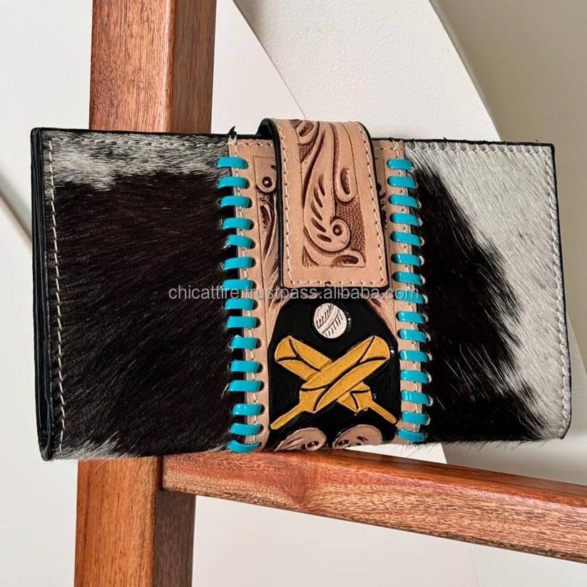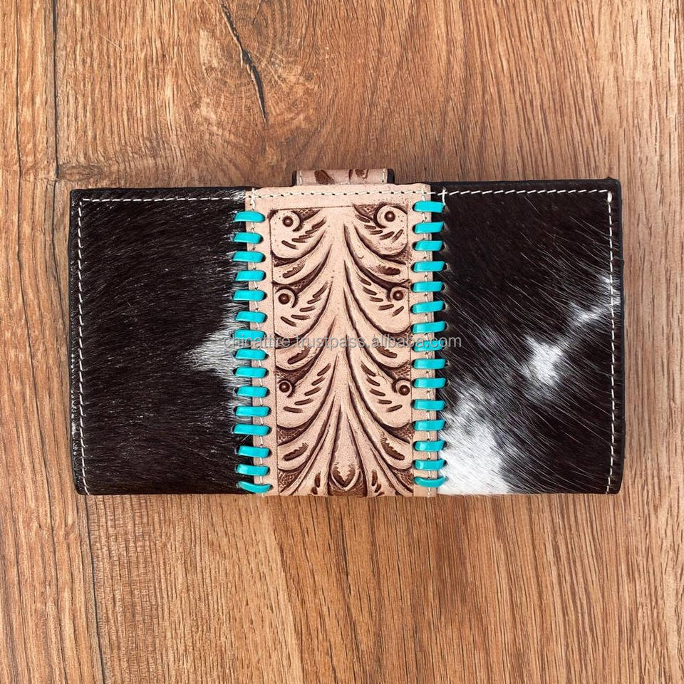 Cuir de fourrure de vachette à motifs occidentaux usinés à la main sculpture pochette coque de téléphone portefeuille élégant multi-utilisations portefeuilles de créateurs